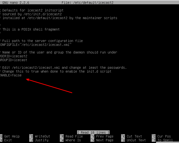 #nano /etc/default/icecast2Lalu pada bagian terbawah terdapat kata ENABLE="false" silahkan ubah menjadi ENABLE="true" sepertin dibawah ini :